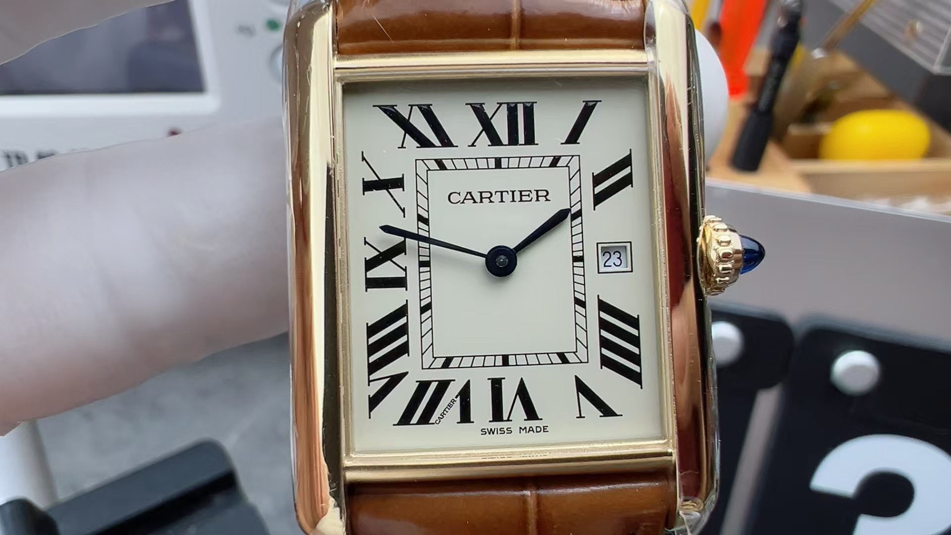Minimalist lines with upgraded strap integration. The quartz model measures only 4.5mm thick — identical to the original Cartier Tank.